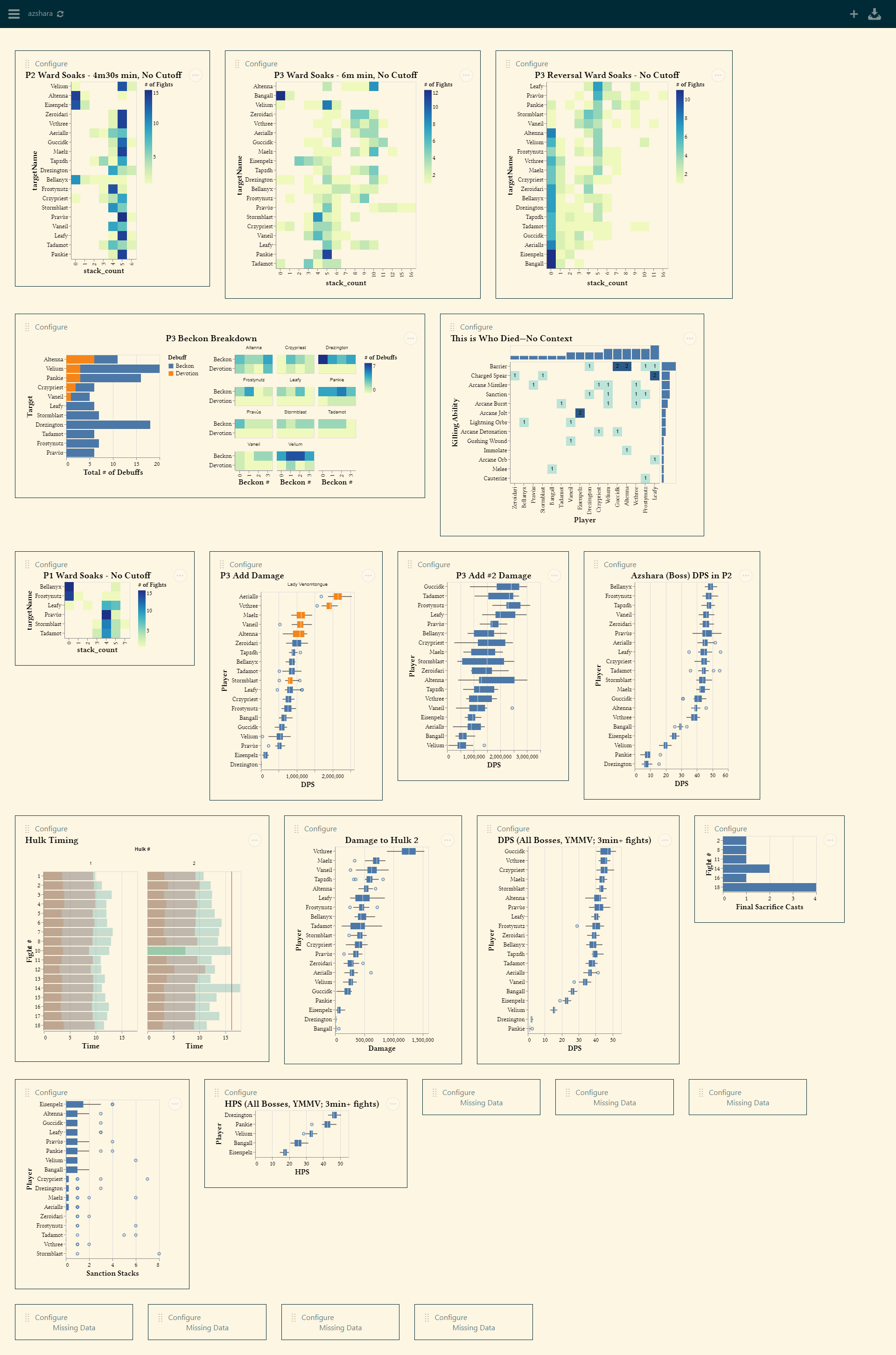 The left figure plots the number of times each player was targeted, along with the number of times they failed the mechanic. The right figure breaks it down by the different stages of the fight. A more complete perspective of what this dashboard looks like can be seen here. This shows every metric that I'd been looking at on this fight and our performance on it on the night we defeated Queen Azshara.