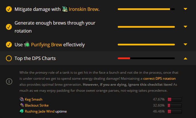 This checklist shows that the player did will on brew generation and Purifying Brew usage, with a little room for improvement on Ironskin Brew usage (which can be expanded for details using the down-arrow). Their use of damaging abilities leaves a bit to be desired, however.